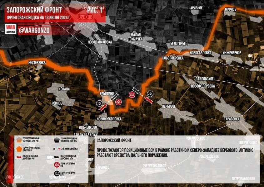 На Запорожском направлении продолжаются позиционные бои в районе Работино и северо-западнее Вербового. Активно работают средства дальнего поражения.