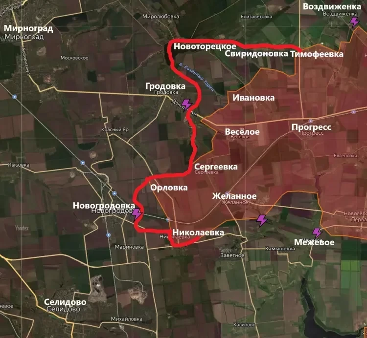 "Покровское направление: русские заняли Николаевку, зашли в деревню Новожеланное. Понемногу начинают нас оттуда выбивать, н.п. Межевое в серой зоне и совсем скоро может посыпаться, также через Николаевку на юг было замечено как россияне продвигался в сторону террикона" - пишут украинские ресурсы, анонсируя новые поражения ВСУ.