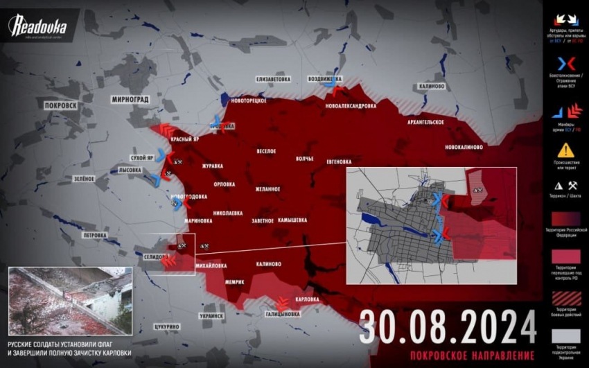 На Покровском и Донецком направлениях российские войска продолжают вести бои за Селидово и Украинск, идет штурм Галицыновки. Также появились свидетельства освобождения Карловки.