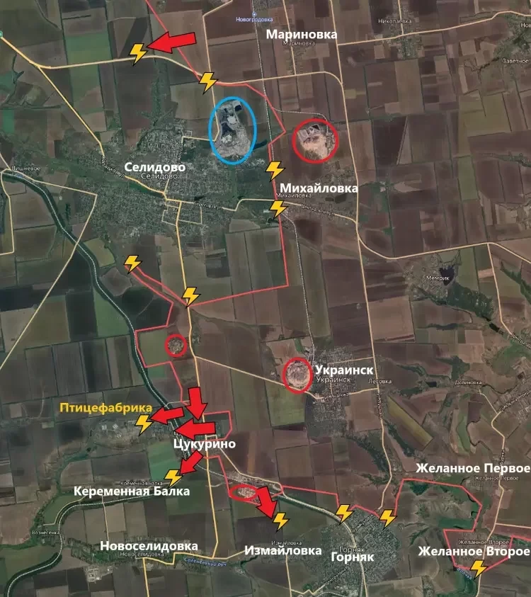 На Селидовском направлении продолжается постепенное взятие Селидово в полуокружение. За последние сутки ВС РФ продвинулись на северном фланге, западнее Мариновки, сообщает PulsePen.