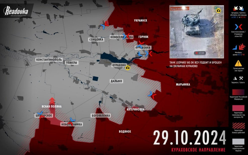 Согласно информации военкора, русские войска зашли в городскую постройку Курахово со стороны Островского. Кроме того, Юрий Котенок отмечал, что для ВСУ наступили не самые лучшие дни: из-за облачности им сложно получать информацию с поля боя по спутникам и дронам, а войска ВС РФ продолжают идти вперед, вопреки осени и распутице.