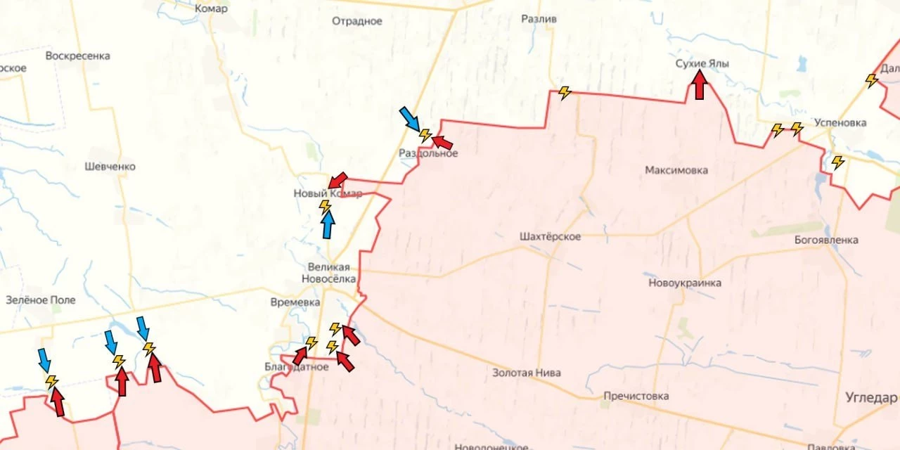 На ВеликоНовосёлковском направлении подразделения группировки войск "Восток" 29 Армии установили полный контроль над н. п. Сухие Ялы, идёт закрепление. В очередной раз отмечаем роль подразделений специального назначения армейского и окружного подчинения в освобождении населённого пункта, пишет Telegram-канал "Воин DV". Также штурмовые группы группировки войск "Восток", а именно подразделения 36 Армии закрепляются на северных окраинах совхоза "Октябрь", он же Благодатное. Одновременно с этим 5 гвардейская Армия группировки войск "Восток" улучшает тактическое положение в свей полосе, есть определённые успехи. В Раздольном ситуация остается сложной, угроза прорыва противника здесь купирована, но он не оставляет попыток овладеть населённым пунктом. В Новом Комаре ситуация остаётся тяжёлой, но меры по исправлению уже предпринимаются.