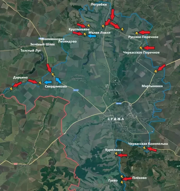 В свою очередь PulsePen следующим образом описывает главные события на курском фронте за сутки: подразделения ВС РФ продвинулись юго-восточнее Кругленького в направлении Викторовки. Несмотря на попытки сопротивления со стороны ВСУ, наши бойцы продвинулись на полтора километра и зачистили лесополосу вблизи населённого пункта. Также идёт наступление на позиции ВСУ в Леонидово.
