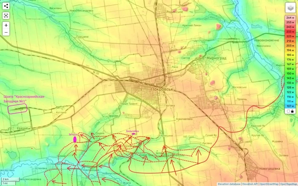 Таким образом, как мы видим и центральная часть фронта обороны ВСУ заметно проседает. И согласно вчерашних данных гауляйтера Покровска, до городской застройки нам осталось пройти менее 2 км.