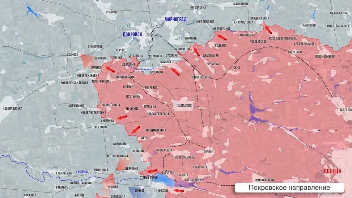На восточном фланге Покровского фронта российские подразделение установили контроль над половиной села Воздвиженка. Под Покровском армия России освободила Новотроицкое, а севернее заняла Песчаное, а судя по некоторым источникам, и Волково. В Песчаном была занята стратегически важная для украинской металлургической отрасли Шахта №3. Еще одна подобная шахта находится в Удачном, в 9 км к западу от Песчаного. Южнее идут ожесточенные бои по линии Нововасильевка-Новоелизаветовка. Нововасильевку наши штурмуют с двух сторон, ведут бои на юге села. Новоелизаветовка перешла под контроль ВС РФ. Между этими сёлами наши продвинулись по высотам, пересекли балку Шумилова и вышли к опорным пунктам противника севернее Новоелизаветовки и северо-восточнее Надеждинки. От Украинки наши штурмовики давят с двух сторон на Ясеновку, от которой идёт прямая рокадная дорога на юг к Андреевке. По оперативным данным, противник потерял контроль над Шевченко, что западнее Старых Тернов.