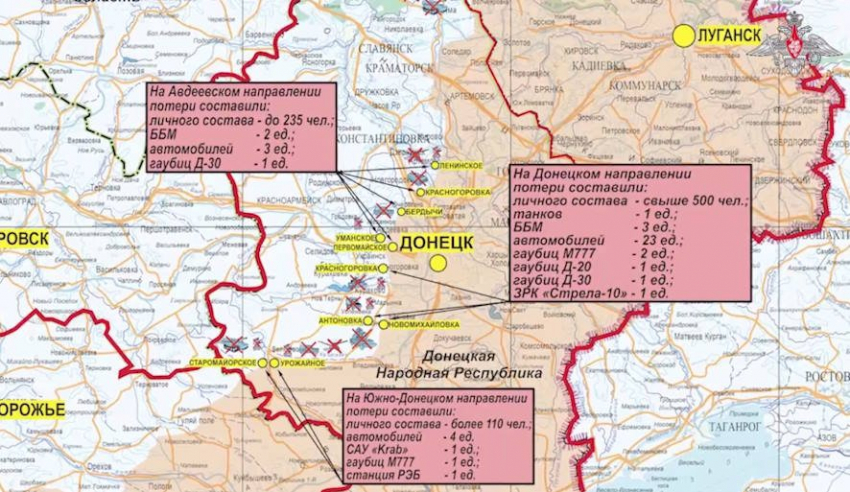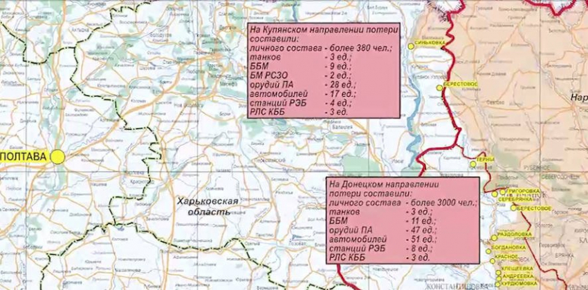 Всего с начала проведения специальной военной операции уничтожено: 583 самолета, 270 вертолетов, 20867 БПЛА, 502 ЗРК, 15782 танка и других боевых бронемашин, 1266 боевых машин РСЗО, 8866 орудий полевой артиллерии и минометов, а также 21010 единиц спецтехники.