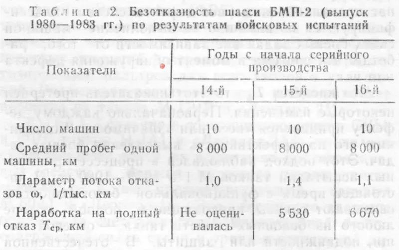 Для сравнения приведены основные данные по безотказности шасси отечественной БМП-2 (табл. 2).