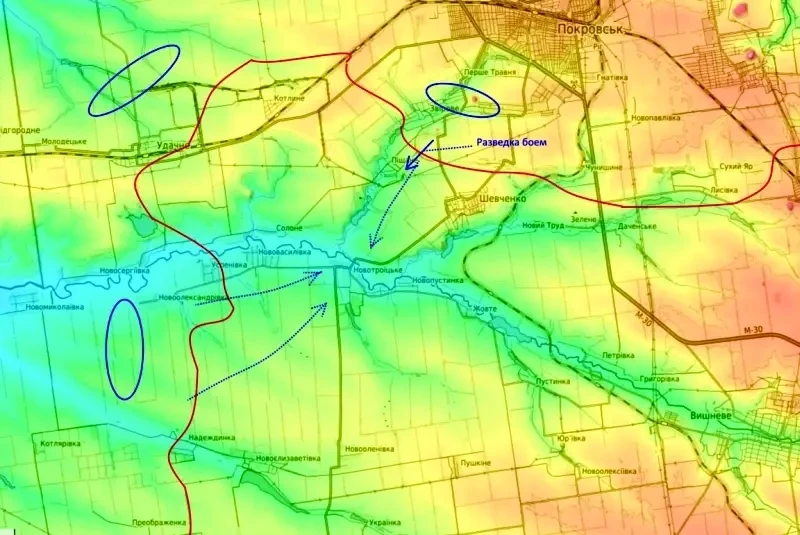 Касательно контратак ВСУ на этом участке. Заслуживающие доверия российские околовоенные паблики сообщают, что небольшие группы противника, действительно, время от времени продолжают проводить атаки на н.п. Песчаное. Заскакивают в него, но впоследствии уничтожаются нашими дронами. Все позиции находятся по контролем ВС РФ. Никакого наступления противника на Красноармейском направлении с трёх сторон нет. Хотя эти наскоки малых групп ВСУ на Песчаное и Котлино могут быть разведкой боем, либо отвлекающими маневрами.