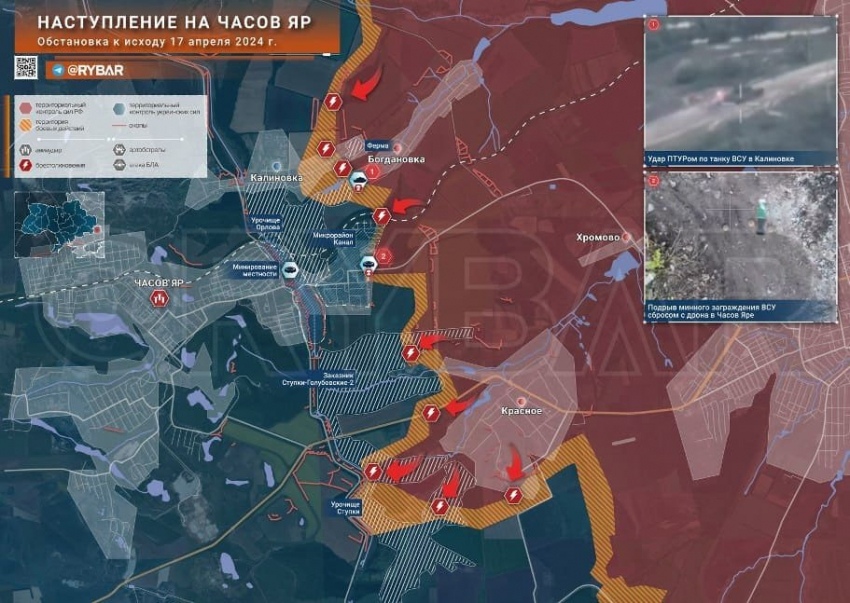 На Артемовском участке ВС РФ усиливают фланги вокруг Часов Яра. С севера бои приближаются к окраинам Калиновки. На южной стороне - от мкр Канал, где удалось занять один из ключевых опорных пунктов ВСУ в балке Ступки Голубовские. Развивается наступление и в городской черте. Авиация, артиллерия, дроны работают почти непрерывно.