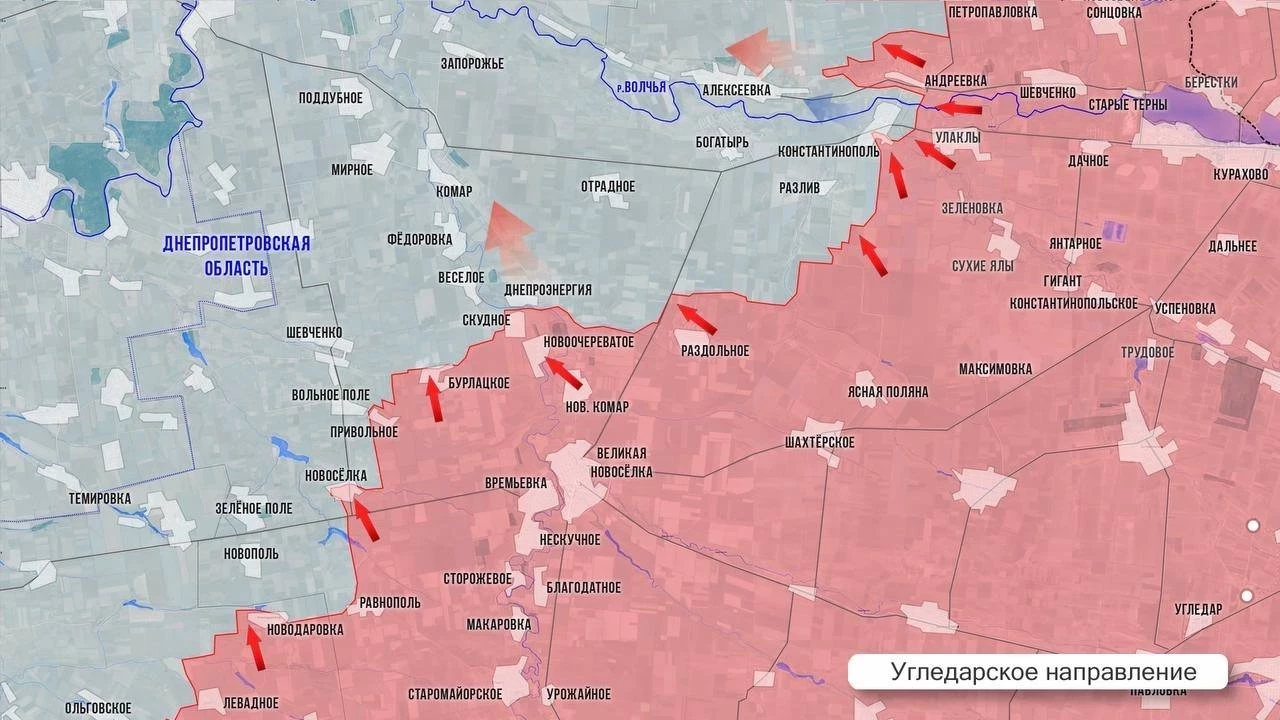 На Угледарском направлении наши войска закрепились в Вольном Поле и двигаются к его центру. К северу от Бурлацкого ВС РФ выбивают врага из лесополос. Со стороны Скудного есть продвижение в сторону Весёлого. Ожесточенные бои в Днепроэнергии и восточнее от села. К западу от Константинополя ВС РФ развивают наступление. Враг отступает в сторону Богатыря. Наши штурмовики проламывают оборону ВСУ южнее Разлива и Богатыря.