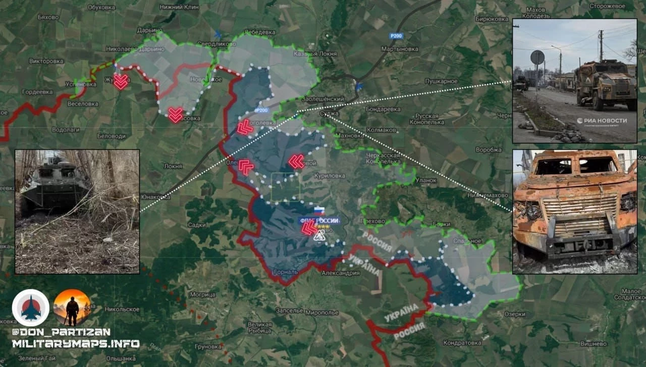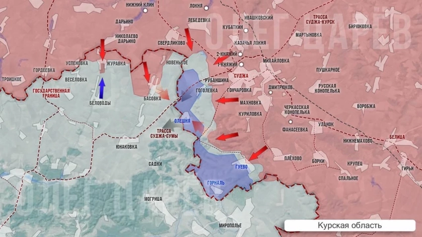 Вооружённые силы Российской Федерации (ВС РФ) ведут ожесточённые бои в районе четырёх сёл у границы: Гоголевки, Олешни, Гуево и хутора Горналь. При этом сообщают, что большая часть Гоголевки и Гуева уже под российским контролем, а также о том, что наши части зашли в Горналь. Однако о полном освобождении сёл говорить до полной зачистки рано, к тому же противник постоянно подбрасывает новые резервы и активно контратакует. На высоте у Гуево наши разведчики уже водрузили российский флаг. Для этого они специально зашли в тыл врага с необходимым оборудованием.