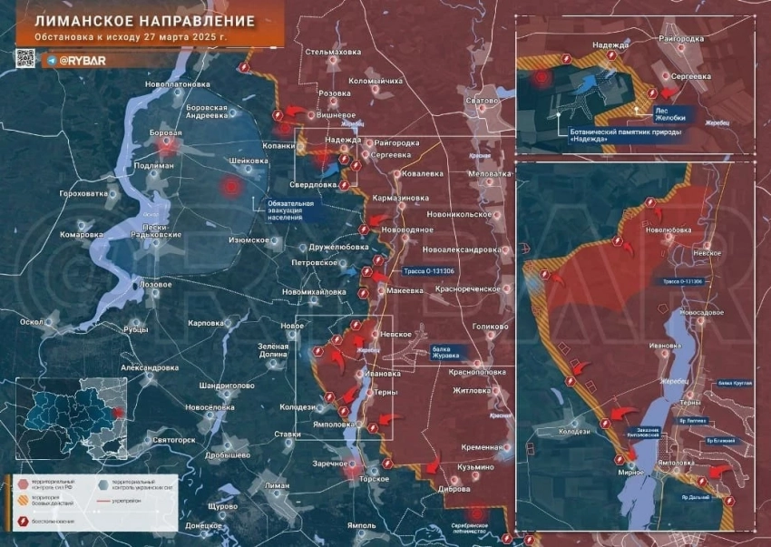С Краснолиманского участка сообщают об эффектном рывке ВС РФ от Новолюбовки в Катериновке, где бойцы закрепились на восточной окраине. После освобождения Мирного, ВС РФ приступили к выравниванию фронта и продвинулись до 2 км южнее Колодезей. Также сообщают о продвижении на 200-300 м от Макеевки к Грековке. Армия России сразу по нескольким векторам продавливает оборону противника в сторону дороги между Лиманом и Боровой. Продвижение южнее Колодезей может иметь целью выход к Ставкам и взятие под контроль дороги на Торское.