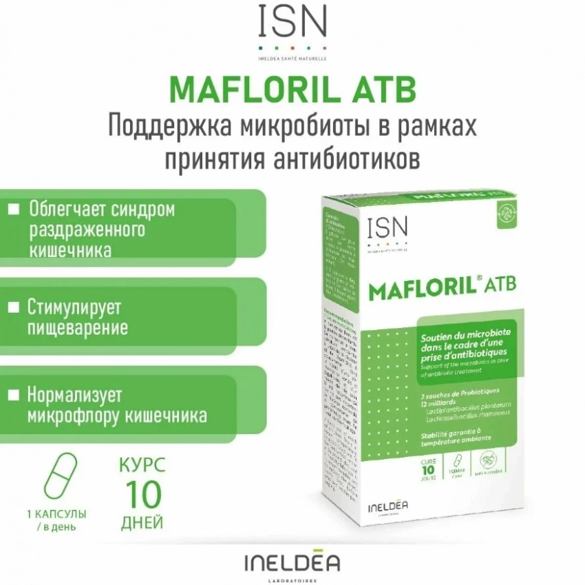 Пробиотики и пребиотики для взрослых 10 капсул (по 495 мг) мафлорил АТБ / MAFLORIL ATB Ineldea Sante Naturelle, БАД для жкт