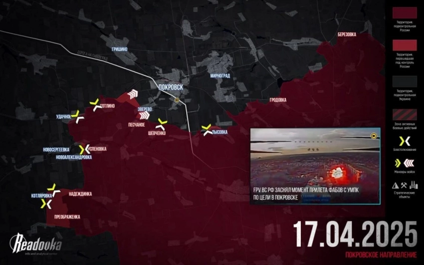 На Покровском направлении Минобороны объявило об освобождении Преображении - села в 6 км к востоку от границы с Днепропетровской обл. К границе областей наши пробиваются севернее, от Надеждинки на Котляровку и южнее от Срибного на Богдановку, Троицкое и Орехово. На охвате Покровска идут ожесточённые бои на рубеже Песчаное - Шевченко - Зелёное - Лысовка за обширную «серую зону». На восточном фланге участка наша авиация бьёт ФАБами по Малиновке, на земле ВС РФ расширили зону контроля у Зелёного Поля, бьются за Тарасовку, а также, продвинувшись на 2 км, наши войска вышли к Миролюбовке, откуда ВС РФ могут давить на Новоэкономическое и севернее, в сторону Константиновки.