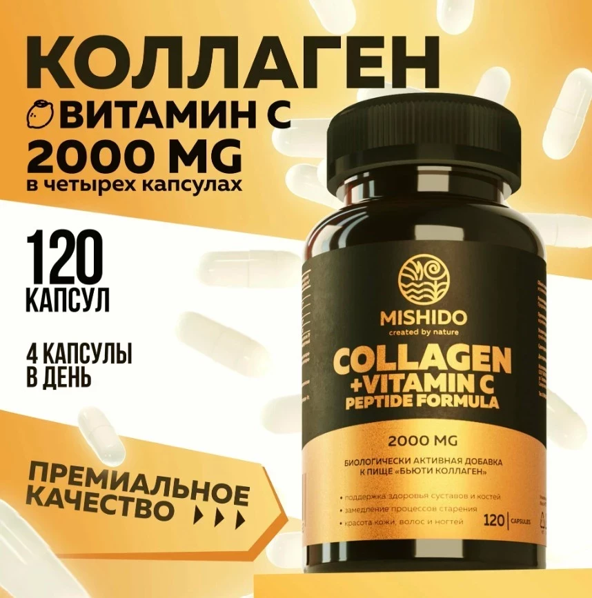 Коллаген и Витамин С MISHIDO 120 капсул, гидролизованный пептиды 2000 мг Beauty Collagen