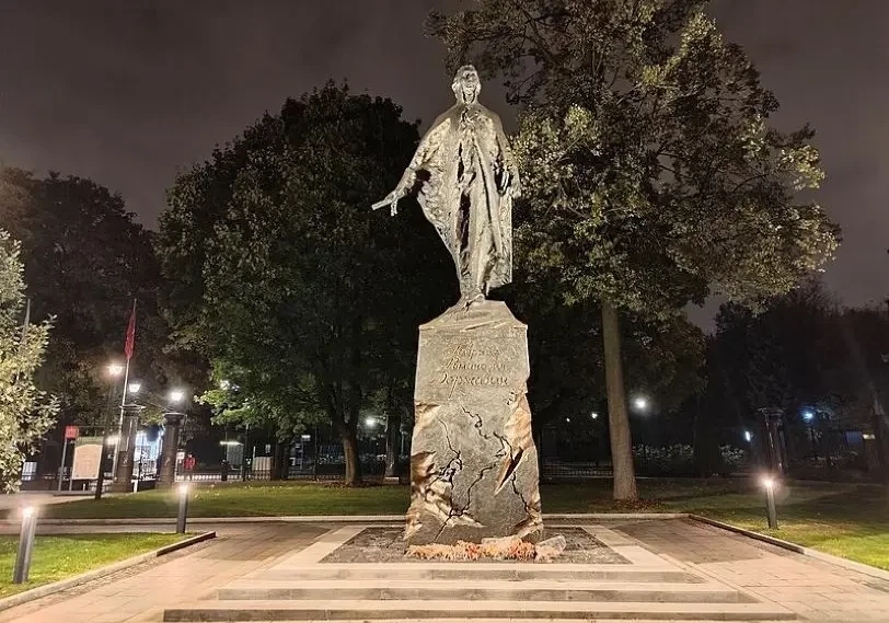 Ребята с камерами лихо обозначили место установки монумента как главный вход Ботанического сада. Много лет живу от него в получасе ходьбы, прогулялся, но Державина не нашёл. Хорошо, что Останкино тоже недалеко, и уже вскоре почти случайно вышел, точнее, вошёл в парк и сразу набрёл на памятник губернатору, министру, сенатору и поэту.