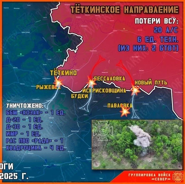 На направлении Рыжевка - Тёткино противник пытался силами штурмовой группы 24 ошб «Айдар» (запрещённая в РФ террористическая организация) в пешем порядке прорваться на южные окраины нашего приграничного посёлка. Пересечения госграницы не допущено, в результате артиллерийских ударов и применения БпЛА большая часть личного состава противника уничтожена, сообщает Telegram-канал "Северный ветер".