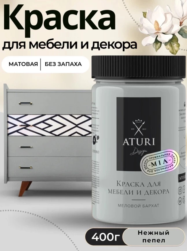 Матовая краска Aturi Design Mia в оттенке «Нежный пепел» — идеальный выбор для тех, кто ценит утонченную сдержанность и долговечность покрытия. Благодаря меловой основе с микромрамором она придает мебели бархатистую ультраматовую фактуру, устойчивую к влаге и легкой влажной уборке при финишном покрытии лаком. Без запаха и гипоаллергенна, краска подходит для широкого спектра поверхностей — от дерева до металла и керамики. Быстросохнущая, легко наносится кистью, валиком или краскопультом, её универсальность и изысканный цвет делают её фаворитом в премиальном сегменте.