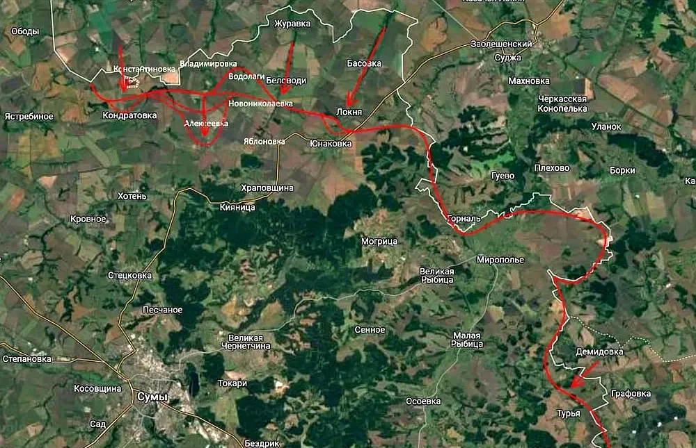 Группировка войск «Север» ВС РФ наступает в Сумской области фронтом шириной 13 километров и в настоящий момент стоит по линии Владимировка - Водолаги - Беловоды - Локня. Дальнейшее продвижение на юг позволит выйти на рубеж Алексеевка - Новониколаевка - Варачино - Яблоновка - Юнаковка и создать плацдарм для выхода на Сумы с севера и северо-востока.