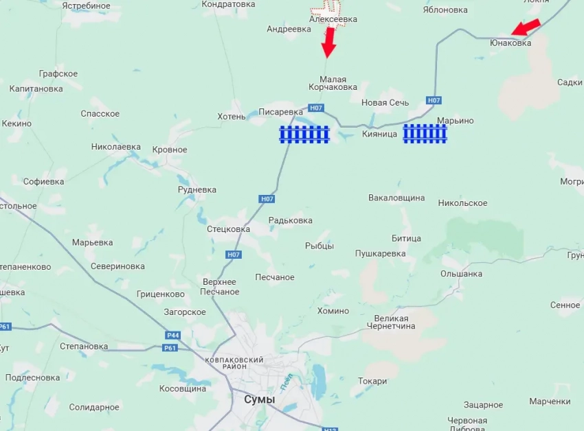 После освобождения Алексеевки наши войска продвинулись южнее – по направлению к Малой Корчаковке. За Малой Корчаковкой – в районе дороги Н07 Сумы-Юнаковка ВСУ строят укрепления – в лесном массиве, стараясь создать линию обороны к северу от областного центра.