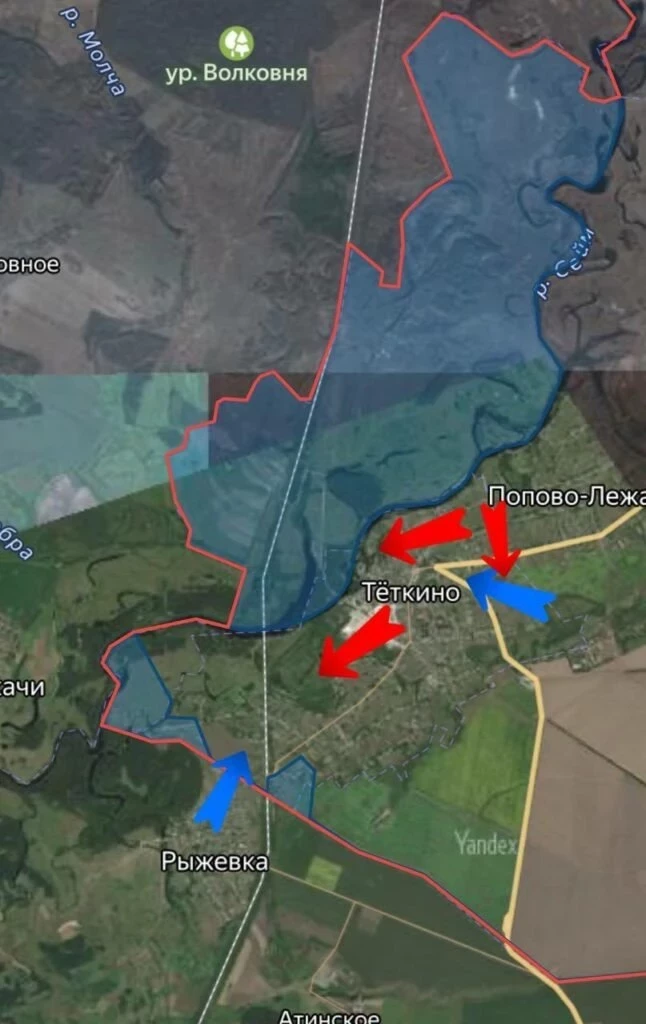 В приграничье Сумской и Курской областей тяжёлые бои в районе Тёткино. Наши военные обороняются фактически в окружении. Конфигурация линии соприкосновения позволяет противнику существенно затруднять снабжение и эвакуацию наших войск. Восточнее, в Сумской области, наши подразделения прошли почти 3 км по трассе и вышли к Малой Корчаковке, обеспечивая выход на линию сёл Хотень, Кияница и Юнаковка.
