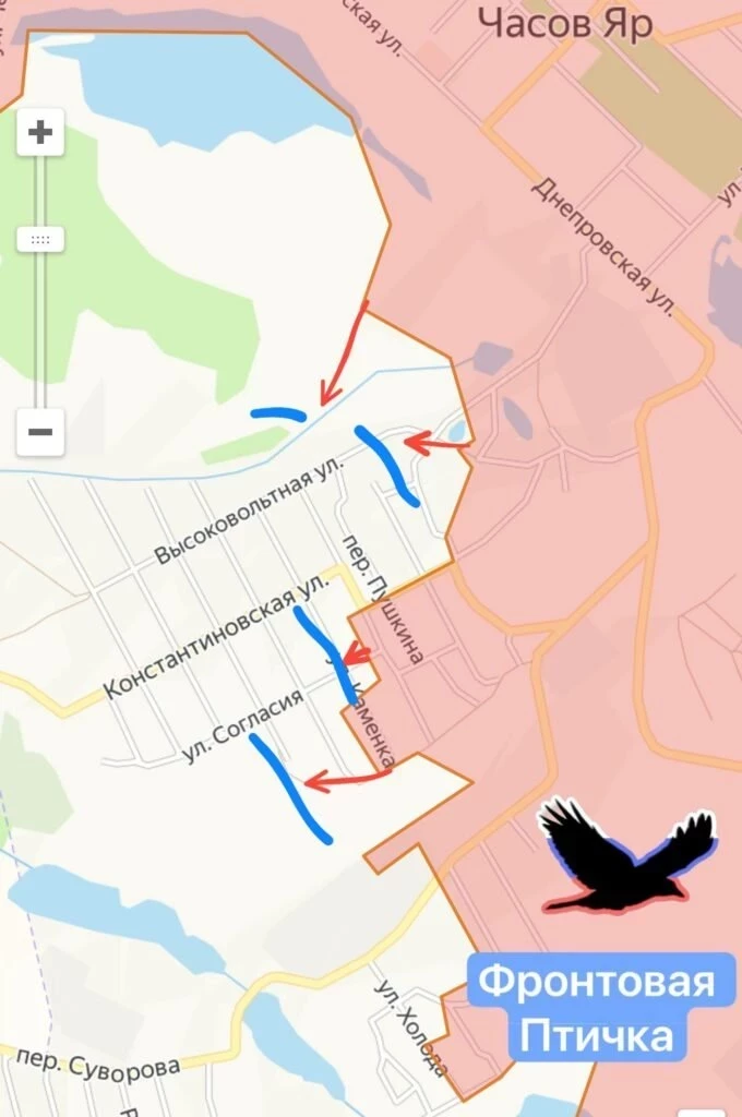 На ЧасовЯрском направлении наши бойцы тяжело продвигаются в центральной части, а также на севере - в районе карьеров, и на юге - в районе Ступочек. Враг готовится к обороне в Предтечино, что находится в трёх километрах от Константиновки.