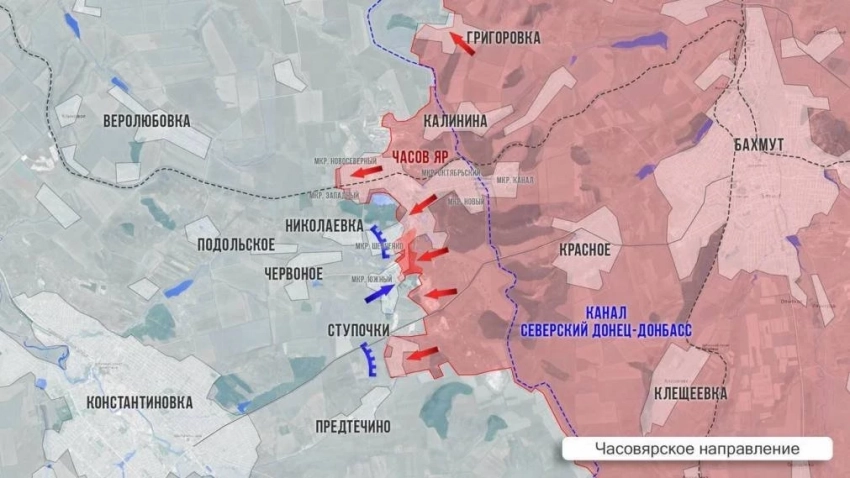 На Часовярском направлении российские войска продолжают давить на оборону ВСУ в Часов Яре и на флангах. О каких-либо продвижениях за последние сутки неизвестно, сообщает Telegram-канал Wargonzo.