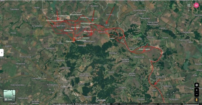 Обозреватель напомнил, что активные бои уже идут в холмистой местности у Малой Корчаковки. В качестве приоритетного направления он выделил условный треугольник Могрица - Большая Рыбица - Мирополье. Однако для полного контроля над коммуникациями ВСУ и подготовки к возможному штурму Сум российским войскам, по его мнению, потребуется занять еще один важный рубеж - линию Малая Рыбица - Осоевка - Угроеды.