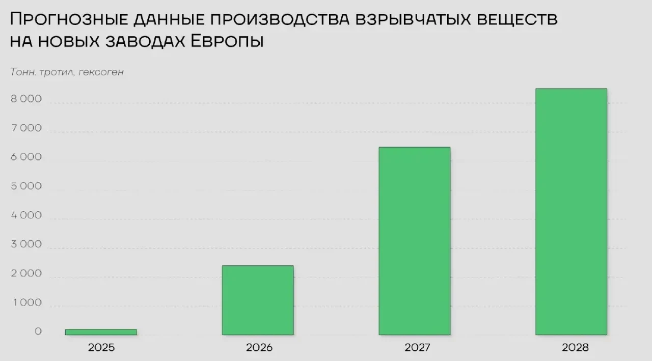 «По результатам реализации планов европейских оборонных компаний, производство взрывчатки на новых заводах превысит 6,5 тонн по итогам 2027 года. Ее объема хватит для заполнения 613-984 тыс. 155-мм артиллерийских снарядов в зависимости от их типа и модели. К концу 2028 года объем гексогена и тротила, производимый за 12 месяцев, превысит 8 500 тонн. Европейские мощности обеспечат сырьем дополнительные 196-303 тыс. артиллерийских выстрелов. И это не считая существующих производственных площадок взрывчатки, мощности которых, как ожидается, будут удвоены к 2026-2027 году».