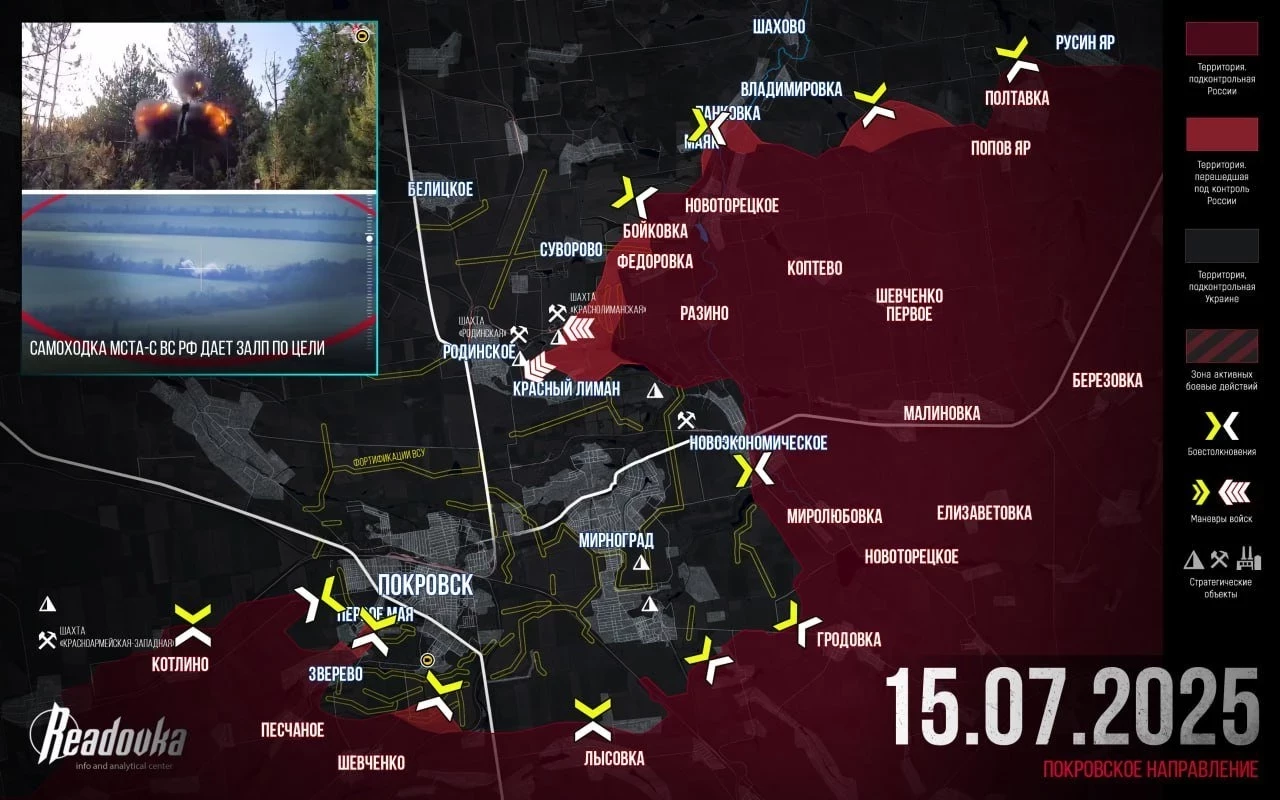 Правый фланг Покровского участка очень активен. Вчера наши охватили Новоторецкое с севера и освободили Маяк, что позволило отсечь Константиновский участок обороны ВСУ от Покровского. Одновременно ВС РФ ударили по укрепрайону ВСУ, прикрывающему Покровск с севера, – по Родинскому и Красному Лиману. Основная сложность этого участка – промзона шахты «Краснолиманская» и терриконы — наши продвигаются на северо-западе шахты, а также на восточные окраины Красного Лимана, который примыкает к Родинскому. Севернее Фёдоровки пробиваются к южным подступам Суворово. Бои в Новоторецком и на подступах к Панковке и Владимировке.
