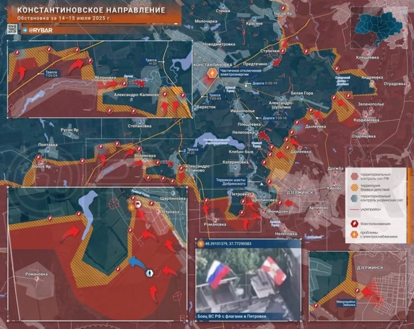 На западном участке Константиновского направления наши вошли в Русин Яр, завязав бои на восточных высотах. В центре Яблоновки ВС РФ на 1,5 км расширили зону контроля, а севернее выбивают ВСУ из опорных пунктов в направлении Степановки. Наши Группы контратаковали в районе Александро-Калиново, заняв район ферм в его северо-восточной части. Ниже по фронту, на западной окраине Торецка, освобождена Петровка, а чуть севернее ВСУ выбиты из Новоспасского. За врагом пока остаются соседние Щербиновка, Катериновка и Клебан-Бык. На восточном фланге направления ВС РФ продвинулись западнее села Дылеевка и взяли ряд высот в направлении Александро-Шультино и Белой Горы. Севернее Часов Яра, в районе Веролюбовки, установлен огневой контроль над дорогой в Константиновку. Наши продвигаются к Майскому. ВСУ укрепляют оборону Константиновки и вокруг. Как пишут, придумывают у ВСУ альтернативный путь снабжения от Дружковки, поскольку ВС РФ, закрепившиеся на высотах в Часов Яре, контролируют основной маршрут, сообщает Олег Царев в своем Telegram-канале.