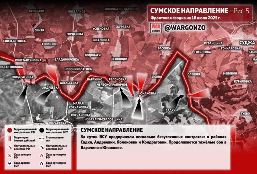 На Сумском направлении за сутки ВСУ предприняли несколько безуспешных контратак: в районах Садки, Андреевки, Яблоновки и Кондратовки. Продолжаются тяжёлые бои в Варачино и Юнаковке.