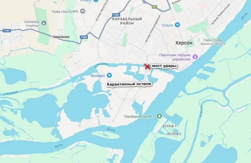 Ранее российские ВКС нанесли серию ударов авиабомбами с УМПК по автомобильному мосту, связывающему Карантинный остров с Херсоном.