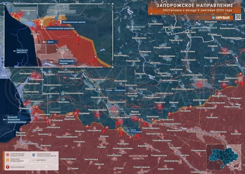 ▪️ На Запорожском участке позиционные бои в районе Приморского и Степногорска. Противник применяет дроны по нашим позициям в Каменском. В районе Новоданиловки и Малой Токмачки без изменений.