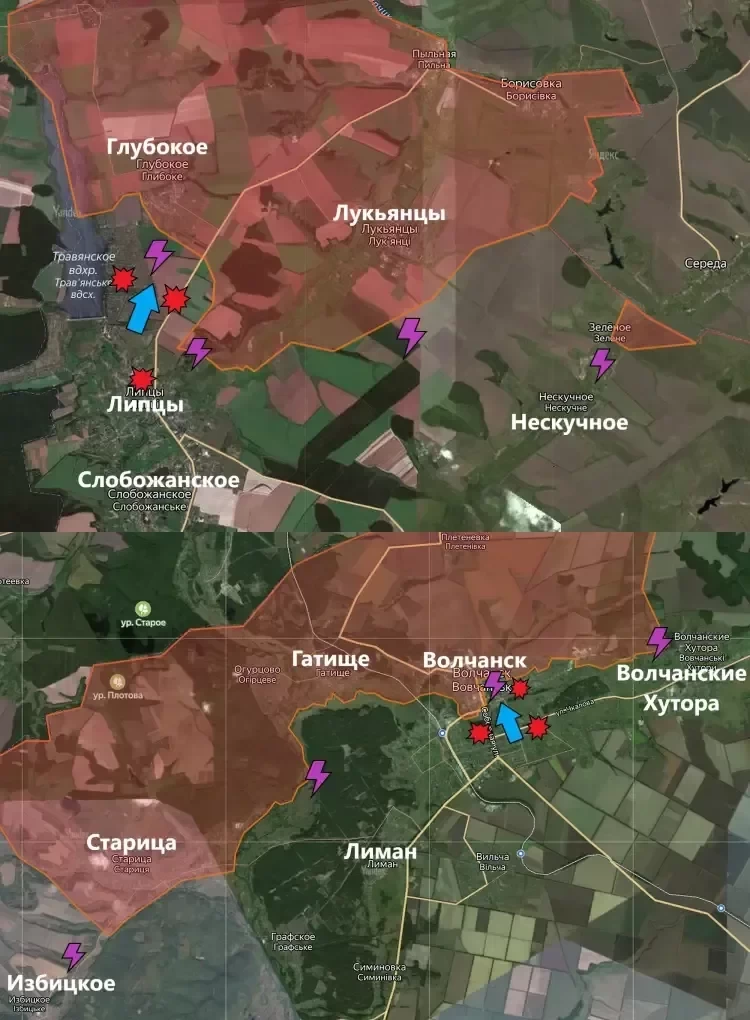 На Харьковском направлении Вооруженные силы Украины (ВСУ) вновь провели несколько атак позиций ВС РФ близ населённого пункта Глубокое. Бронетехника противника вновь была подбита, а спешившийся десант - уничтожен. Северо-восточнее Липцев продолжаются встречные бои. Помимо этого, боестолкновения идут южнее Лукьянцев, где располагаются важные тактические высоты, контролируемые врагом.