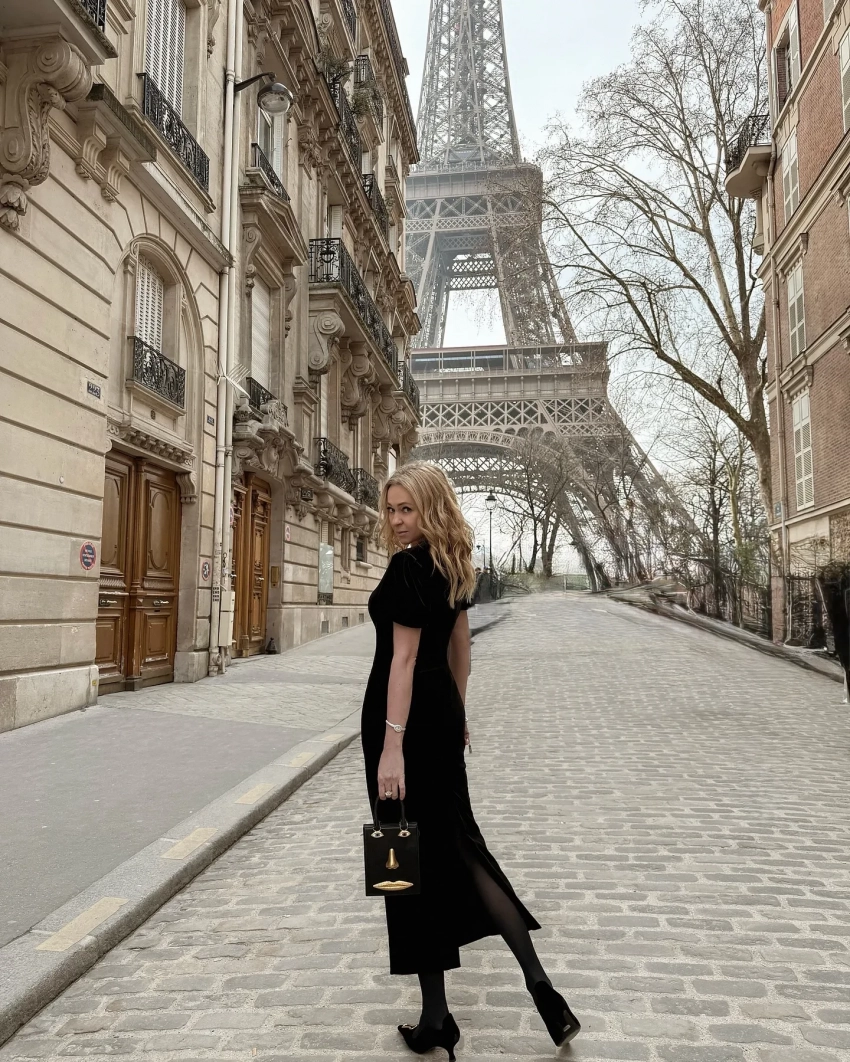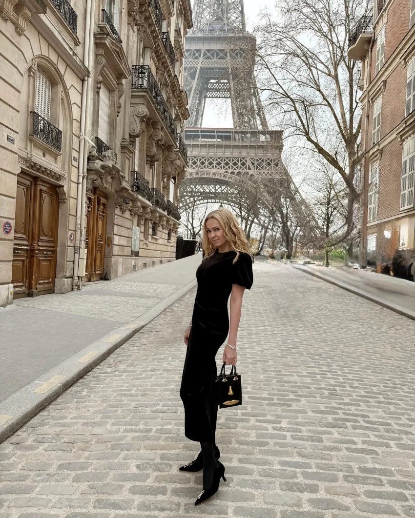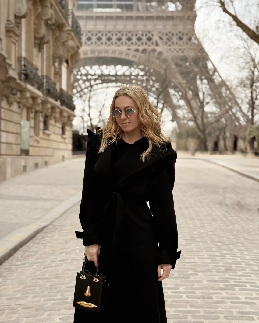 На одной серии снимков Рудковская позирует на фоне Эйфелевой башни в чёрном платье. Образ она дополнила сумочкой "с лицом" и украшениями.