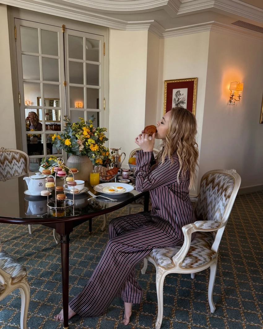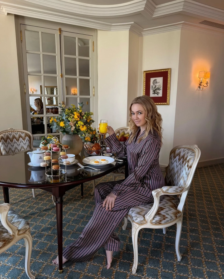 Яна Рудковская/Фото: rudkovskayaofficial/Instagram*Также продюсер опубликовала несколько снимков из своего отеля Bristol: из холла, а также из номера, где она завтракает в полосатой пижаме. Рудковская рассказала, что сейчас живёт в номере, где снимали сцены из фильма Вуди Аллена "Полночь в Париже". "Аллен всегда тут останавливается и часто додумывает свои фильмы по ходу съёмок", — подписала Рудковская фотографии. Её муж, 42-летний фигурист Евгений Плющенко, не поехал с ней в Париж, сейчас он ставит новое ледовое шоу.
