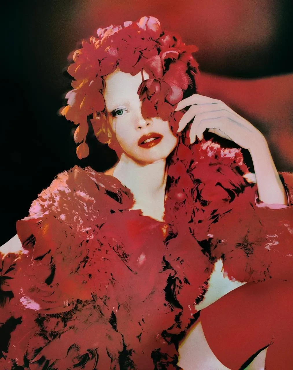 На снимках Наталья предстает в образах, навеянных атмосферой кабаре и ретро-цирка. В объективе Елизаветы Породиной модель позирует в платьях, созданных с использованием ручной вязки и бисера, в атласном кутюрном макси и в мини, напоминающем кольчугу, с жемчужными бусинами. Но главным украшением коллекции стала алая цветочная накидка из сетки, украшенная шифоновыми соцветиями и полностью расшитая жемчугом и кристаллами.