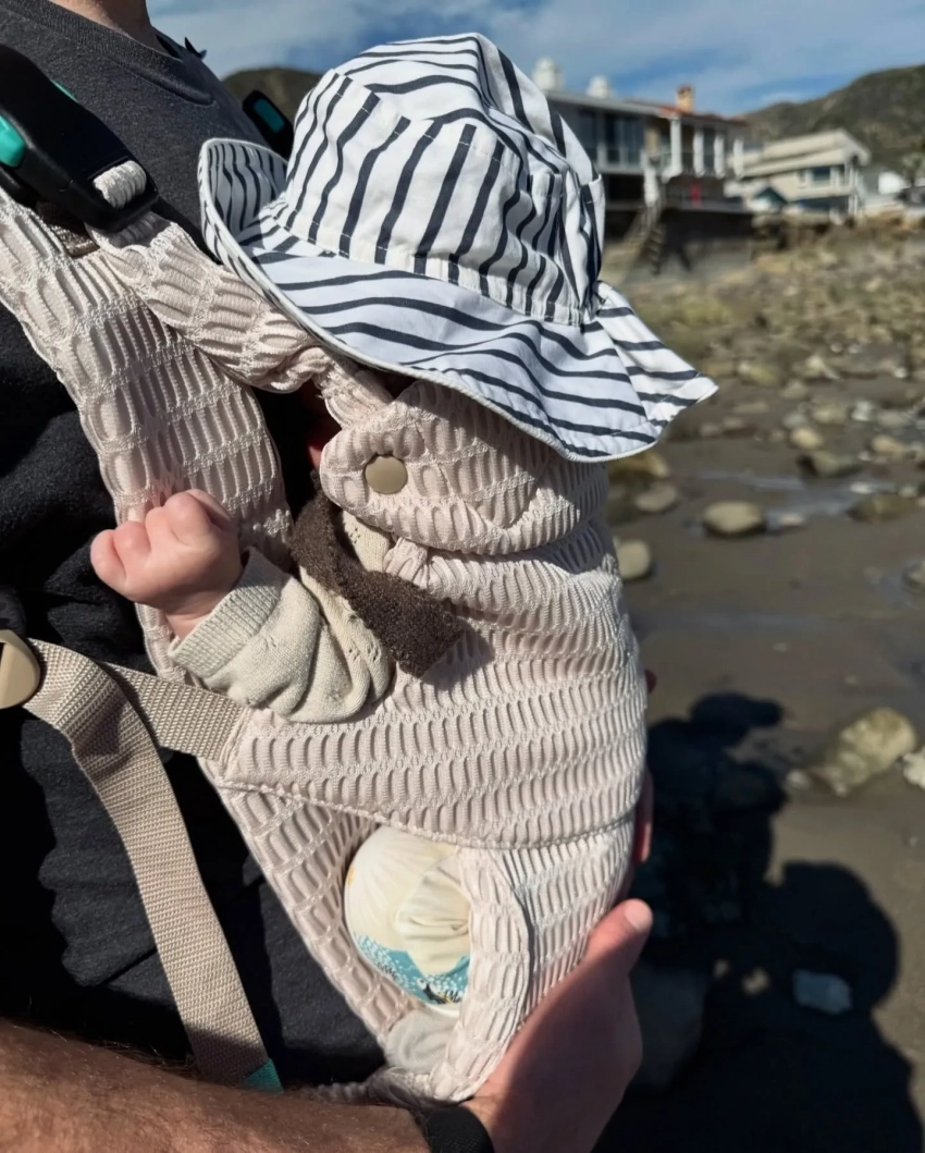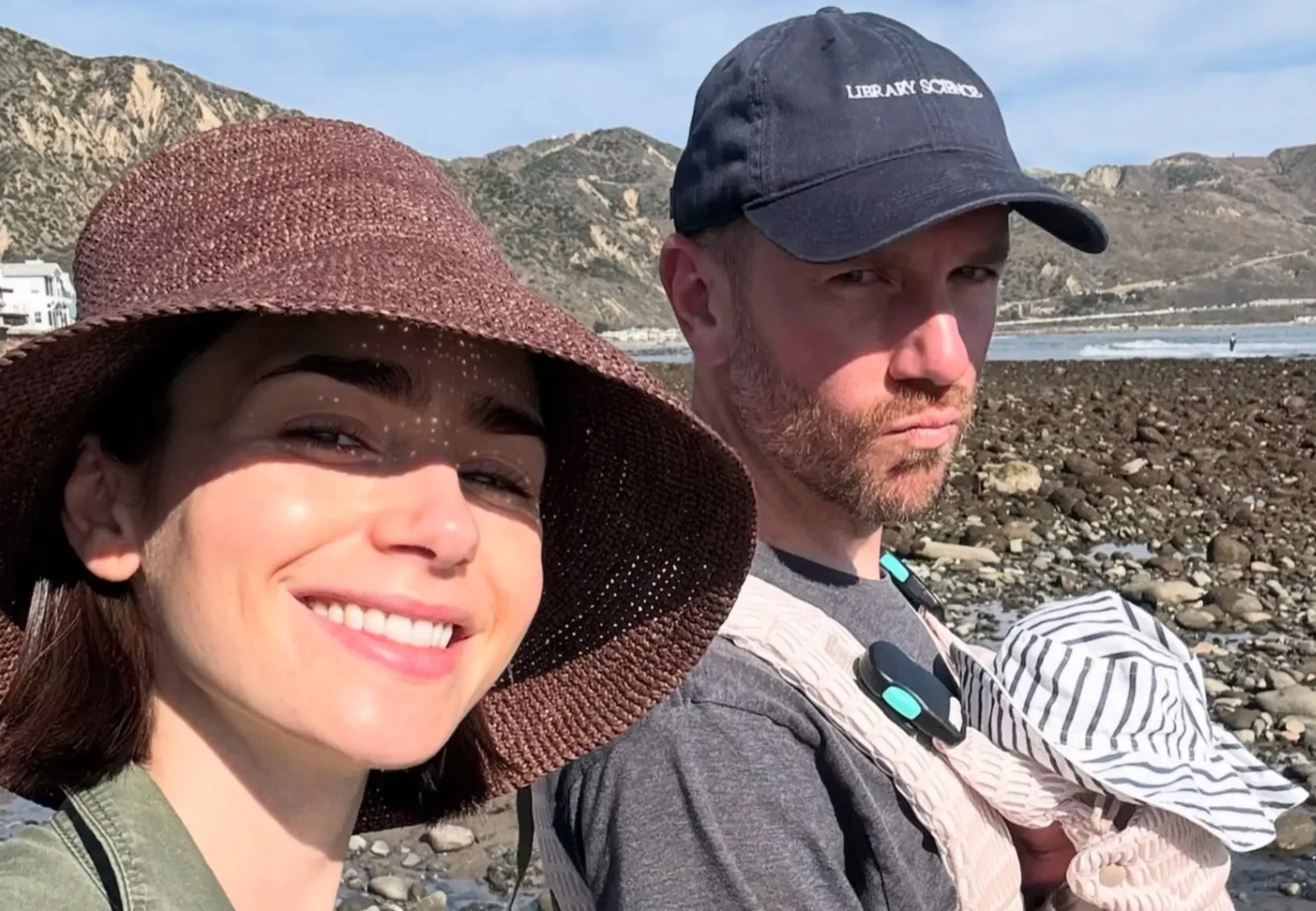 На кадрах звезда сериала "Эмили в Париже" запечатлела семейную прогулку по пляжу. Лили улыбается в камеру, а Чарли несёт их дочку в розовом слинге, шуточно хмурясь. Лица девочки не видно, потому что её голову закрывает белая панамка в полоску. Лили также добавила снимок с малышкой в более близком ракурсе, а также с Чарли и дочкой на фоне моря. "Первый пляжный день Туве!" — подписала она публикацию.