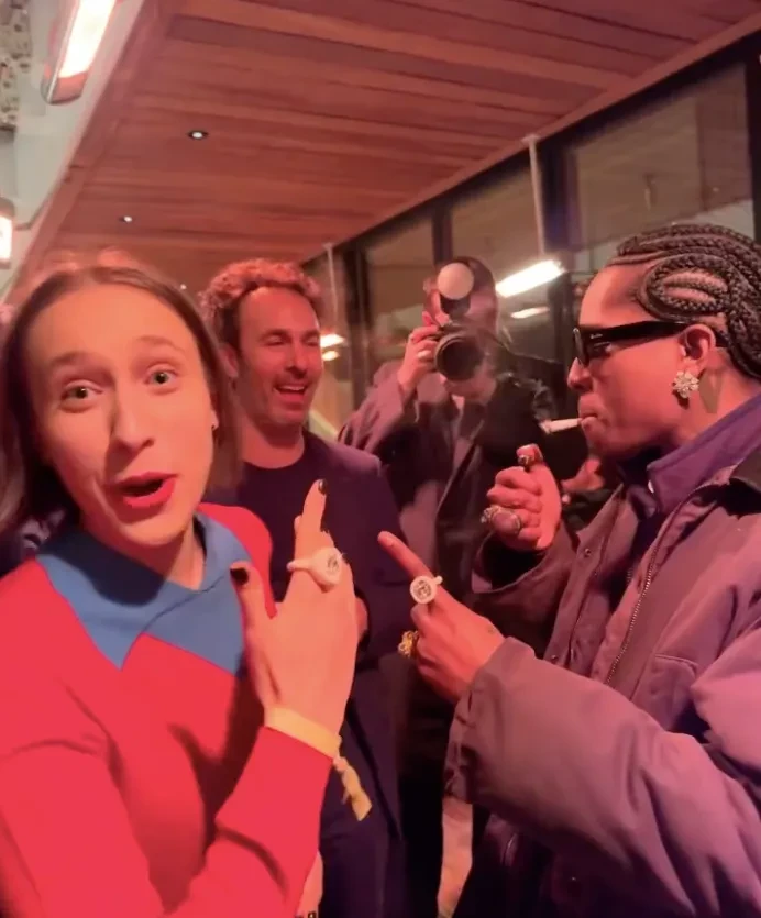 На вечеринке Miu Miu, которая прошла после показа, главными звёздами стали Марк Эйдельштейн и A$AP Rocky. 23-летняя звезда "Аноры" познакомился с рэпером на шоу, а также позировал на фото с Лоттой Волковой, креативным директором Prada и Miu Miu — Миуччей Прадой, а также с Дианой Коркуновой. A$AP Rocky тоже сделал несколько снимков с блогершей и пообщался с основательницей бренда Lili Archive Лили Григалашвили, примерив кольца её марки. На вечеринку Лили пришла с сестрой Алиной, бывшим редактором моды Vogue и шеф-редактором Ushatava.