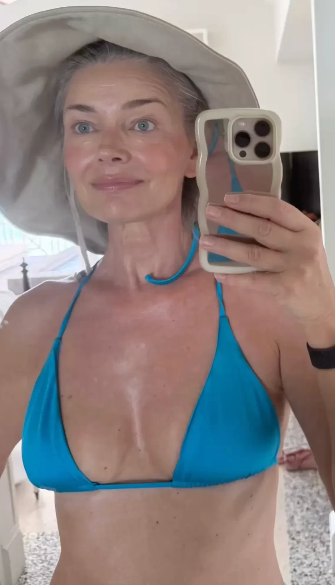 Супермодель Паулина Поризкова опубликовала селфи в бикини в честь своего 60-летия. На снимке звезда подиумов 1990-х с улыбкой позирует в зеркале в голубом купальнике и шляпе.