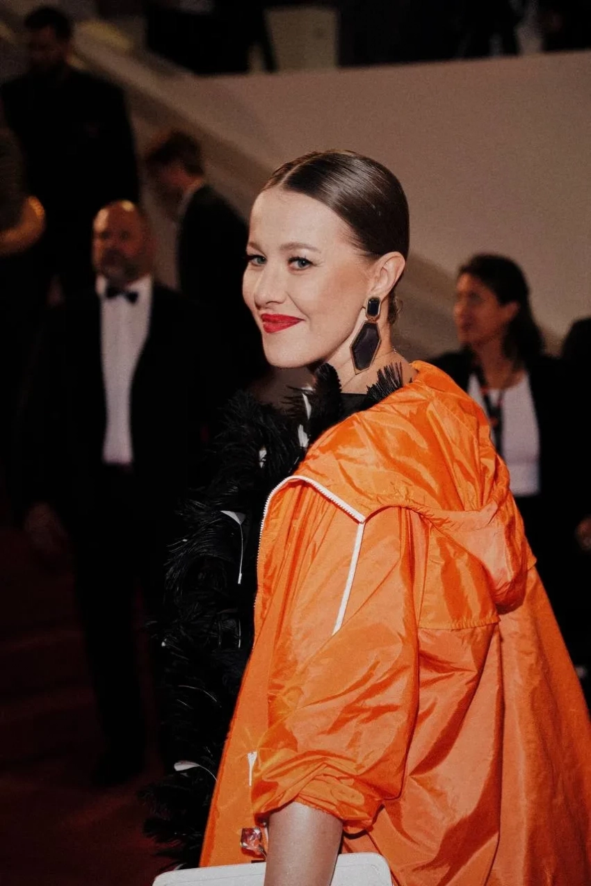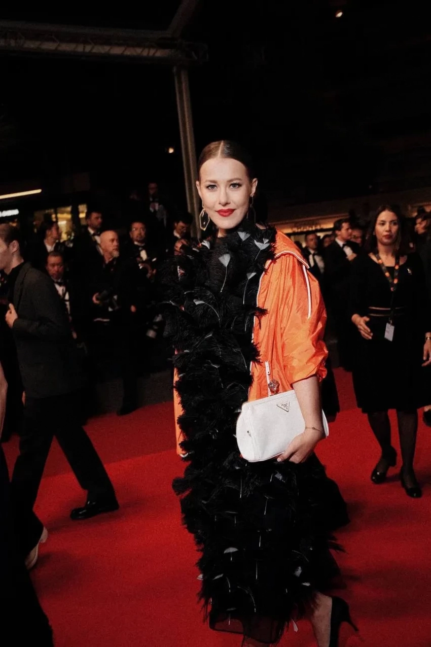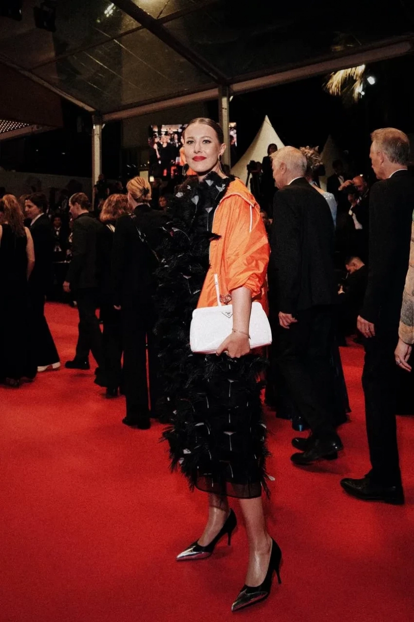 Для вечера Собчак выбрала чёрное платье с перьями в сочетании с ярко-оранжевой курткой на молнии из весенне-летней коллекции Prada 2025 года. Образ дополнили белый клатч и туфли на высоких каблуках с серебристым мысом. "Ну просто не смогла не добавить каплю футуристичности красной дорожке кинофестиваля", — отметила она в своём телеграм-канале.