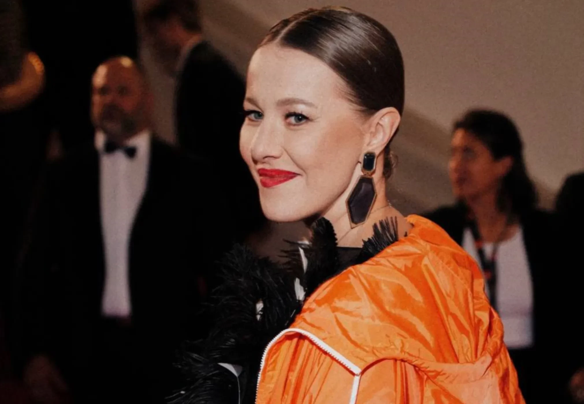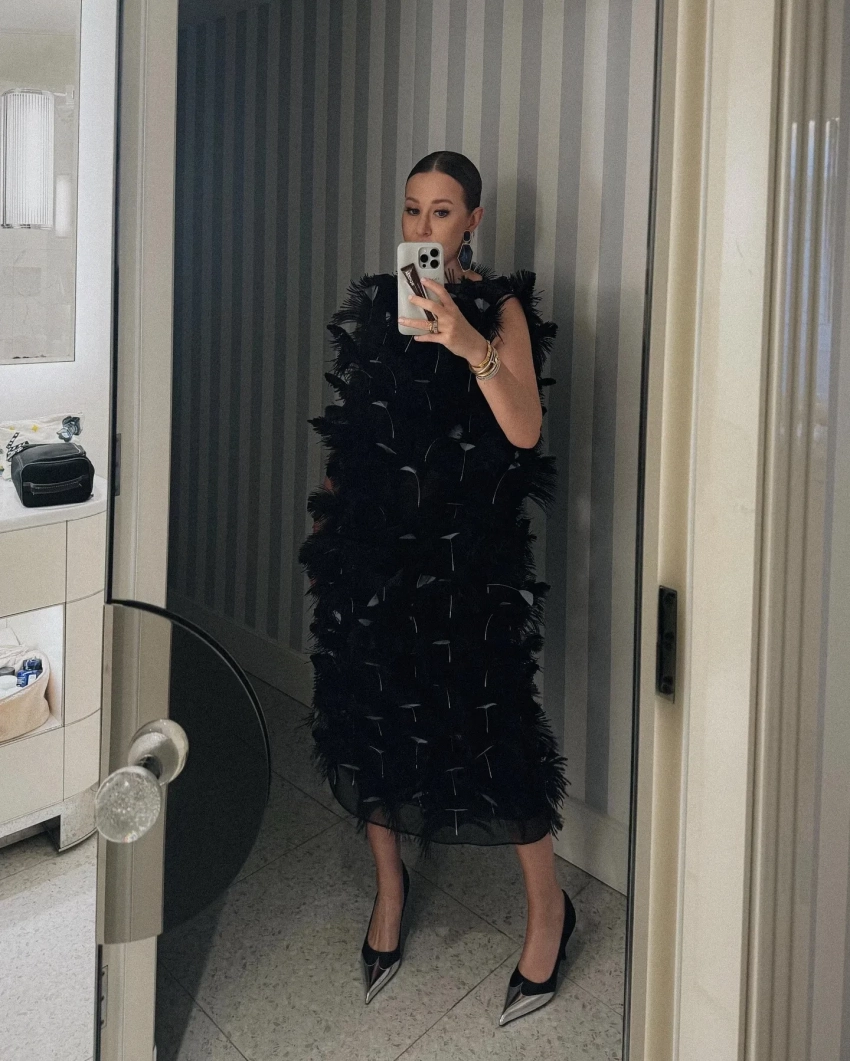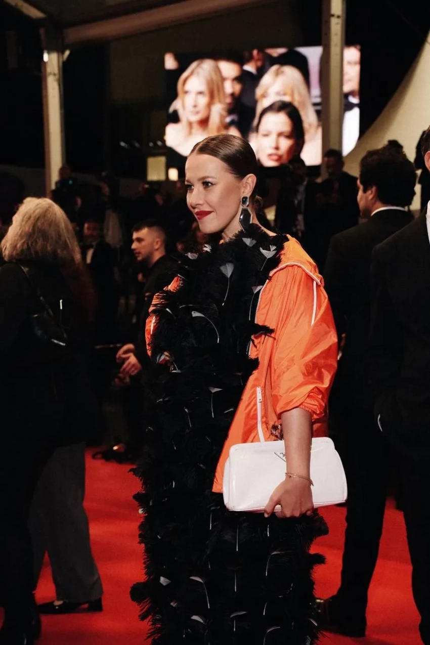 Для вечера Собчак выбрала чёрное платье с перьями в сочетании с ярко-оранжевой курткой на молнии из весенне-летней коллекции Prada 2025 года. Образ дополнили белый клатч и туфли на высоких каблуках с серебристым мысом. "Ну просто не смогла не добавить каплю футуристичности красной дорожке кинофестиваля", — отметила она в своём телеграм-канале.