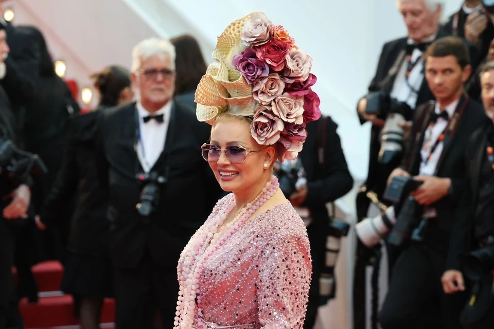 Писательница пришла на премьеру фильма «Новая волна» в нежно-розовом вечернем наряде, расшитом стразами. Ее прическа стала настоящим произведением искусства: голову Лениной украсила целая россыпь розовых, лиловых и красных цветов.