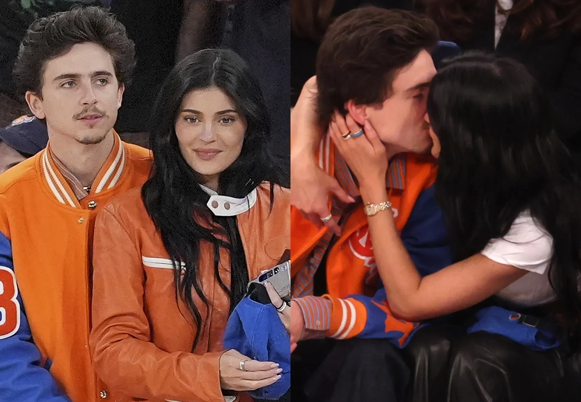 Тимоти, как давний поклонник Knicks, выбрал для выхода сине-оранжевый бомбер с символикой команды, чёрные брюки и массивные ботинки. Кайли поддержала бойфренда и пришла в белой футболке с логотипом Knicks, кожаных брюках и бело-оранжевой мотоциклетной куртке, дополнив образ туфлями на шпильке.