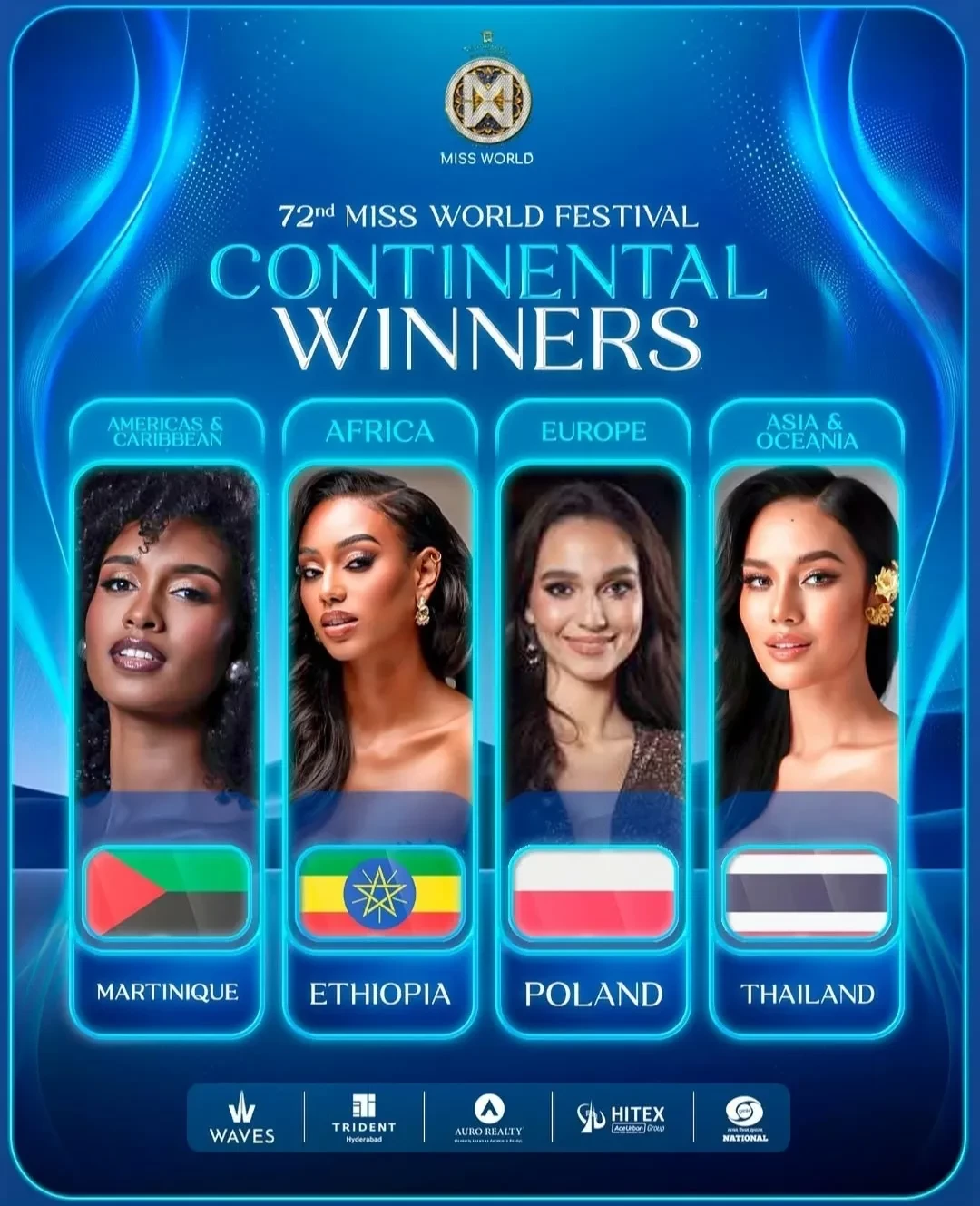 Опал Сучата ЧуангсриЧто касается первой вице-мисс, то ею стала Хассет Дередже Адмассу из Эфиопии. Титула второй вице-мисс удостоилась представительница Польши Майя Клайда, а третьей вице-мисс — участница из Мартиники Орели Жоахим.