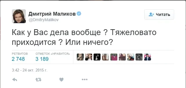 Дмитрии Маликов стал мемом в сети, так как ведёт свои соцсети в нетипичном для звёзд стиле с юмором и самоиронией. Всё началось с того, что в 2015 году он опубликовал в Х (на тот момент Twitter) фразу: "Как у Вас дела вообще? Тяжеловато приходится? Или ничего?", которая быстро стала вирусной. Пользователям, особенно молодёжи, нравится, как он пишет о своей жизни, а также комментирует текущие новости.