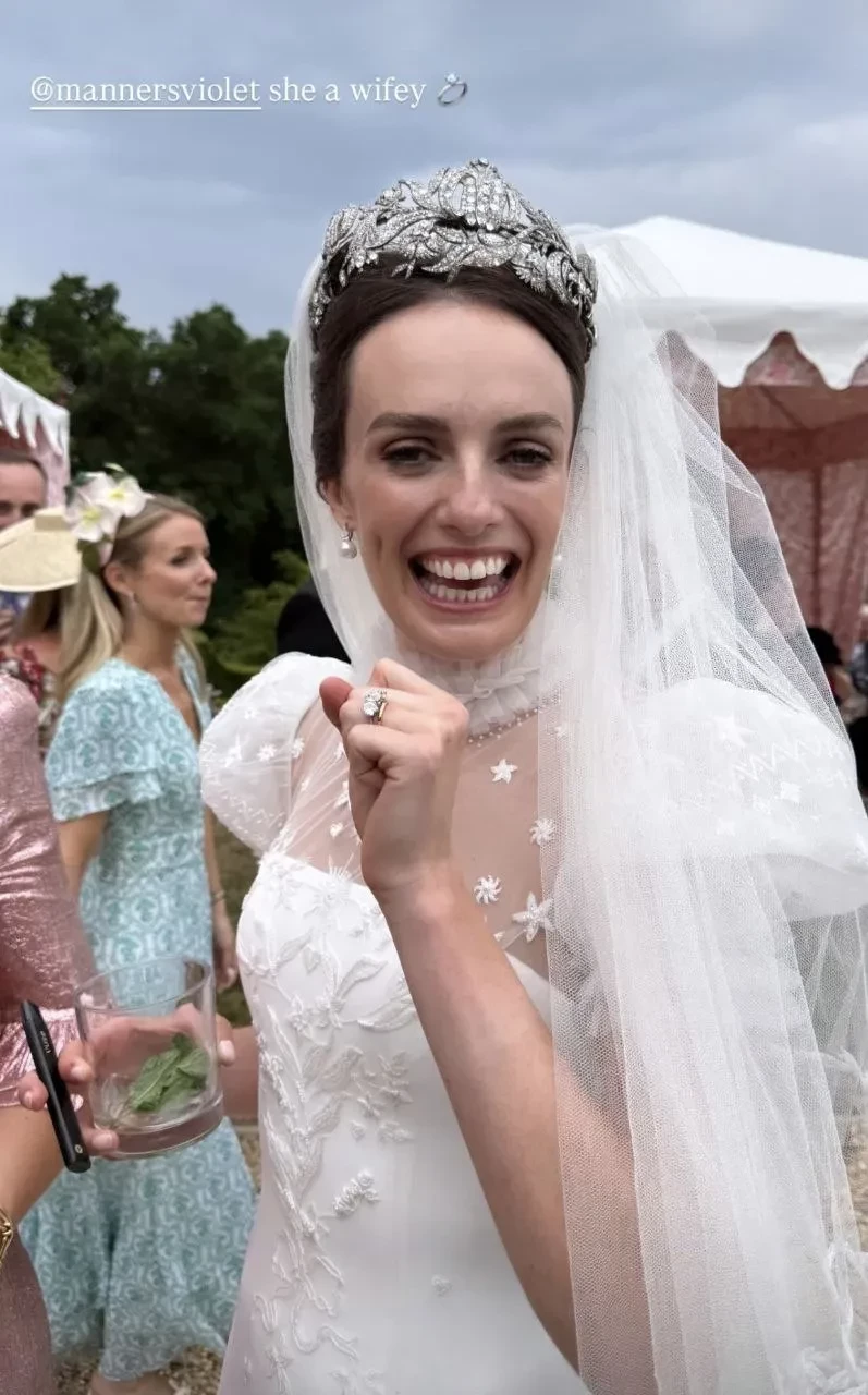 Избранником 31-летней Мэннерс стал наследник 16-го графа Линдсея Уильям Джеймс Линдсей-Бетьюн. Торжество прошло в родовом поместье невесты, замке Бельвуар — том самом, где проходили съёмки сериала о британской королевской семье "Корона". 33-летний жених, шотландец по происхождению, был в традиционном килте, на Вайолет было кутюрное платье от Phillipa Lepley и фамильные украшения, в том числе Ратлендская тиара, которая принадлежит её семье с XVIII века.