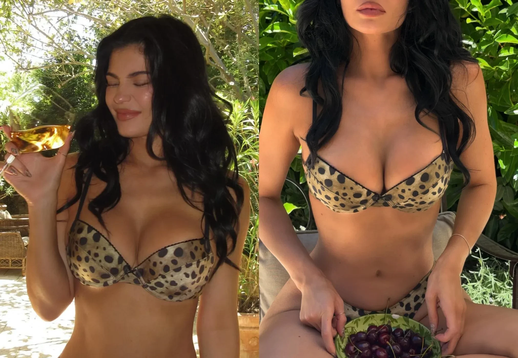 Кайли Дженнер продолжает свой отпуск в Тоскане. 27-летняя инфлюенсерша опубликовала в инстаграме* серию фото, на которых позирует в леопардовом бикини. От украшений она отказалась, вместо этого в качестве аксессуаров выступили бокал вина и миска черешни.