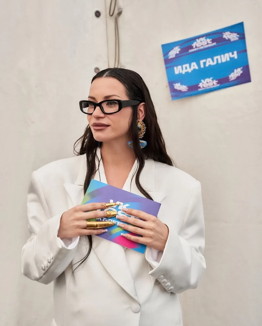 Ксения Собчак и Ида ГаличЗа два дня фестиваля 35-летняя Ида примерила несколько луков от российских дизайнеров. Она носила чёрный брючный костюм Lesyanebo, боди с полупрозрачной юбкой Autentiments, металлический жакет Viva Vox и белый костюм "1811", дополнив образ украшениями Schiaparelli. На этот раз над образами Галич работал не её постоянный стилист Олег Горчанин, а Эльмира Тулебаева.